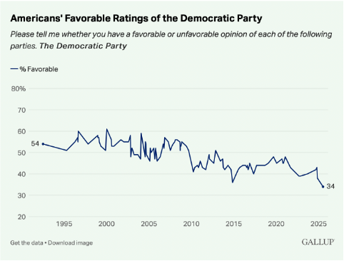 In the almost nine months since the 2024 election, a July 25th Wall Street Journal poll showed that the Democratic Party’s favorability rating had dropped even farther than the Republican Party’s.